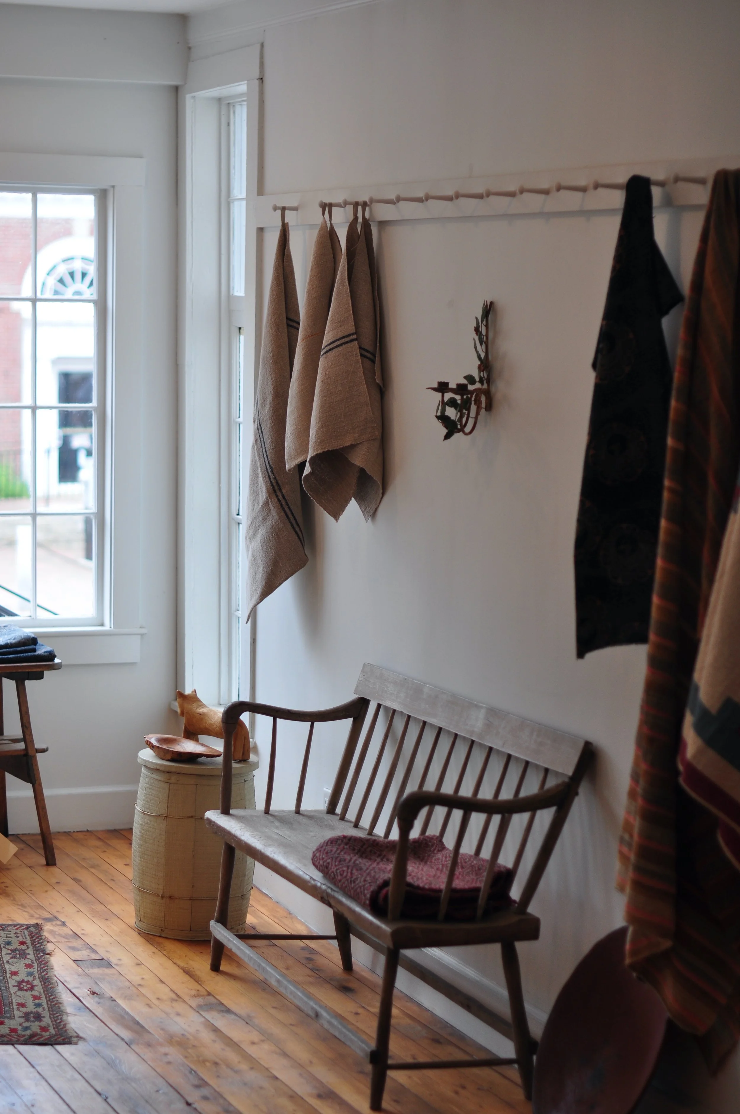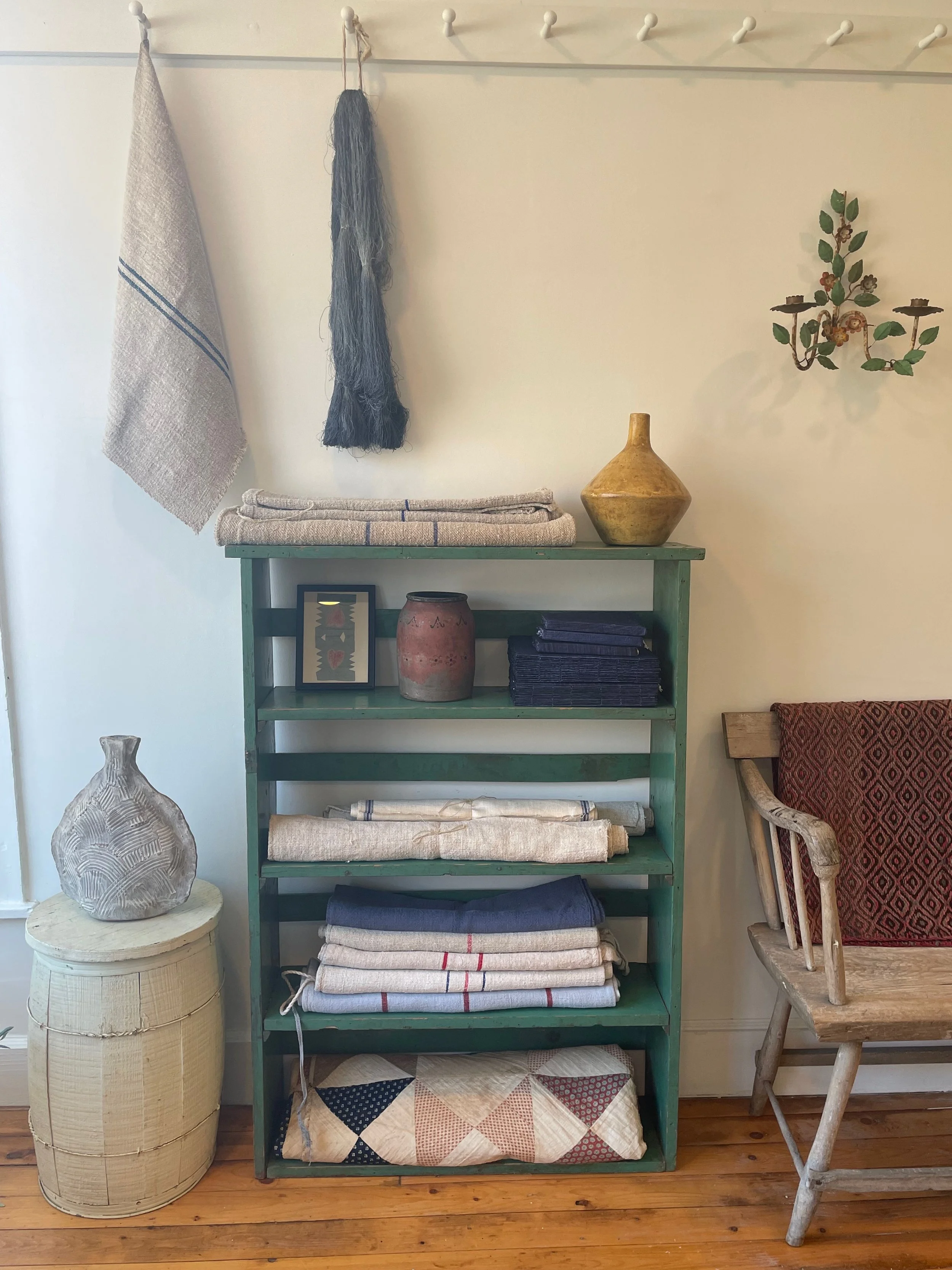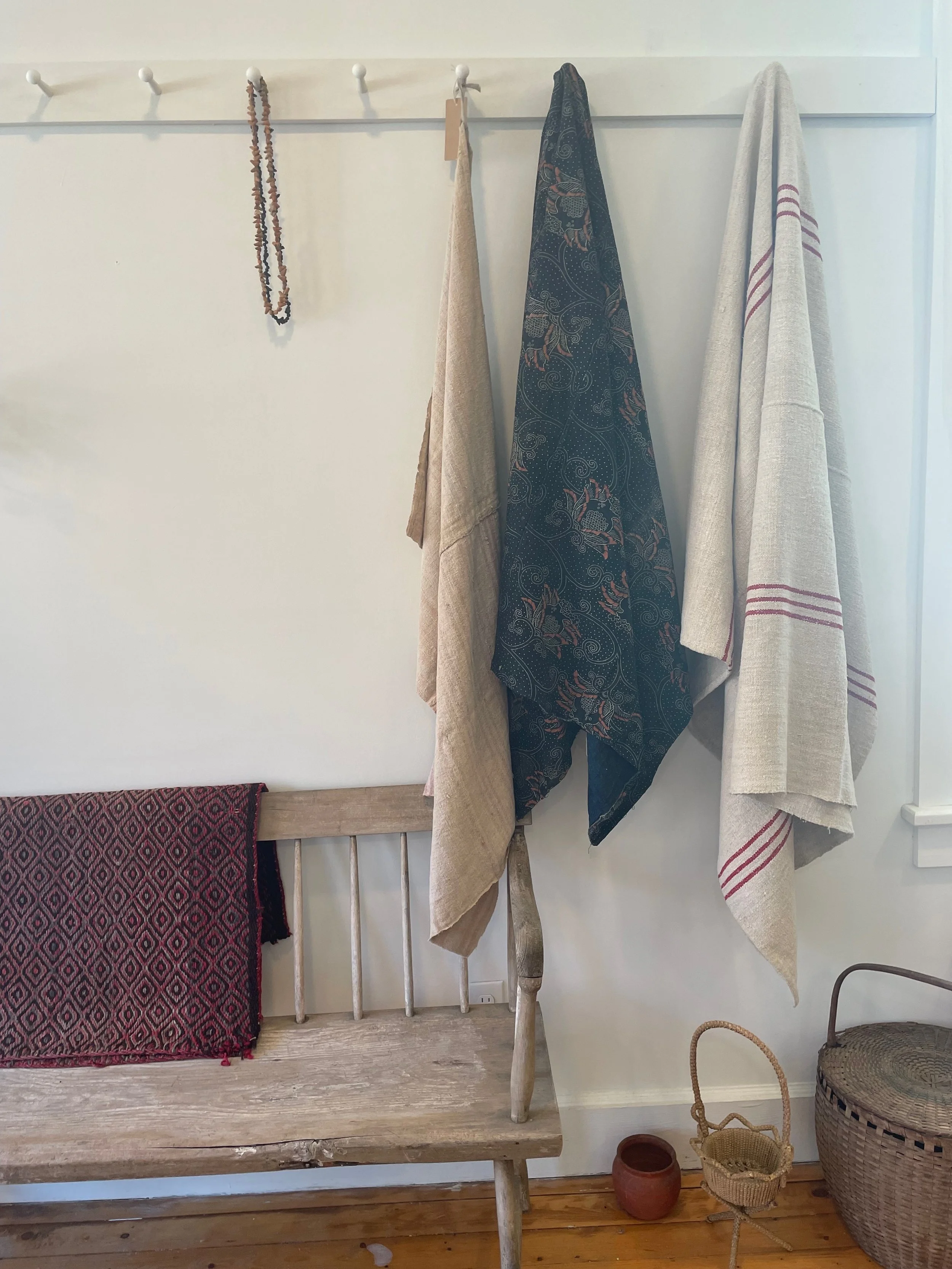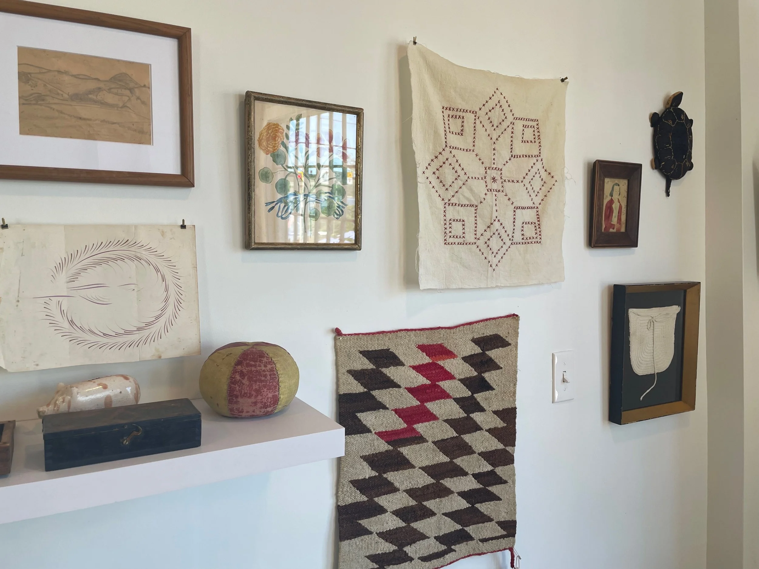 A varied collection of antique and vintage textiles and objects create a still life on the wall in Ley Lines, 64 Main St.